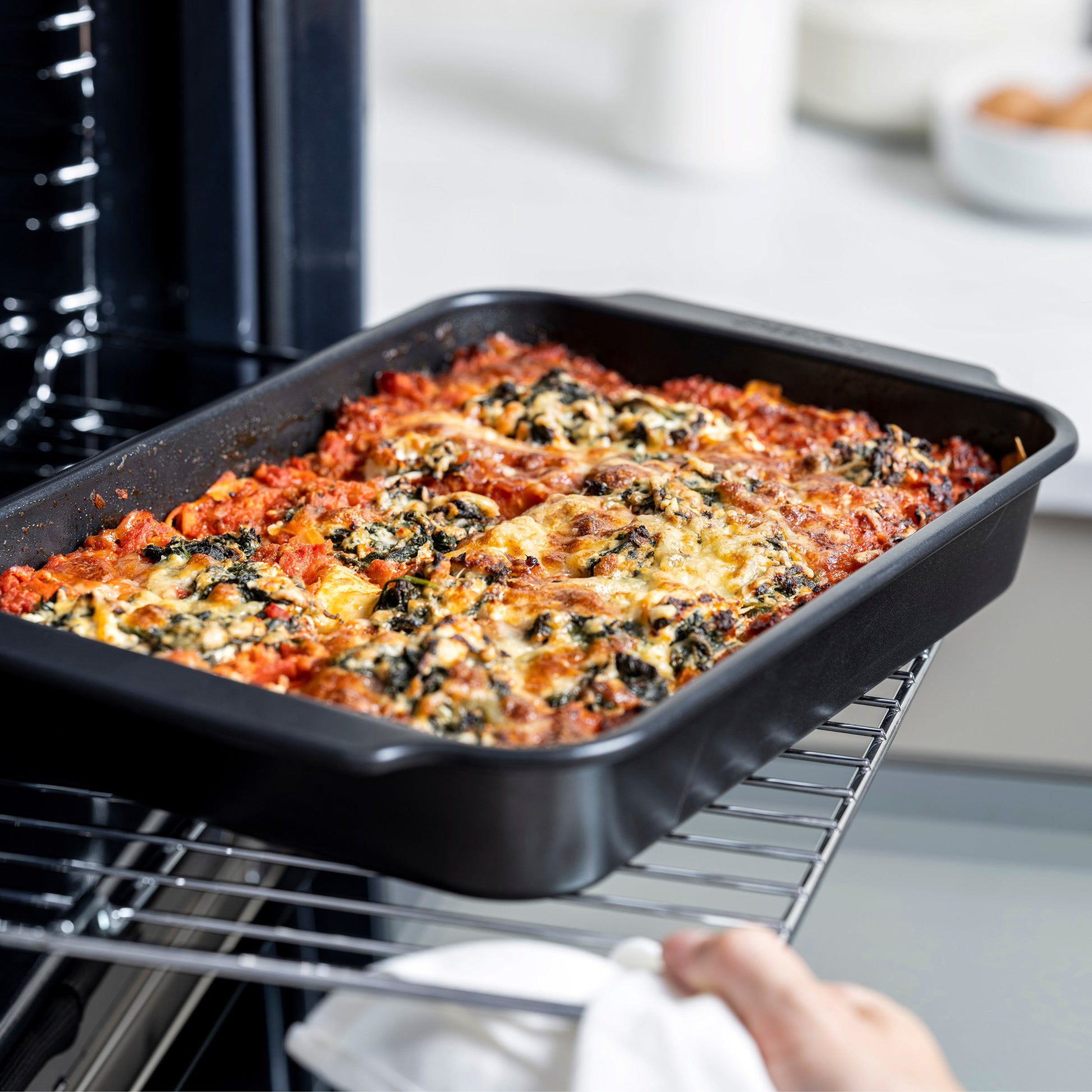 Mit seiner neuen Backform-Kollektion bringt GreenPan sein Know-how im Bereich PFAS-freier Antihaftbeschichtungen vom Herd in den Backofen! Die Kollektion besteht aus robustem, aluminisiertem Stahl, wodurch sie extrem widerstandsfähig ist. Sie ist kratz- und korrosionsbeständig und verzieht sich nicht. Die PFAS-freie Antihaftbeschichtung sorgt dafür, dass sich Speisen leicht lösen lassen, sodass deine köstlichen Kreationen beim Herausnehmen aus der Backform nicht beschädigt werden. Das Reinigen der Backformen ist ein Kinderspiel. Alle Backformen – mit Ausnahme der Springform und der Muffinform – sind zudem spülmaschinenfest. Das macht es noch einfacher!