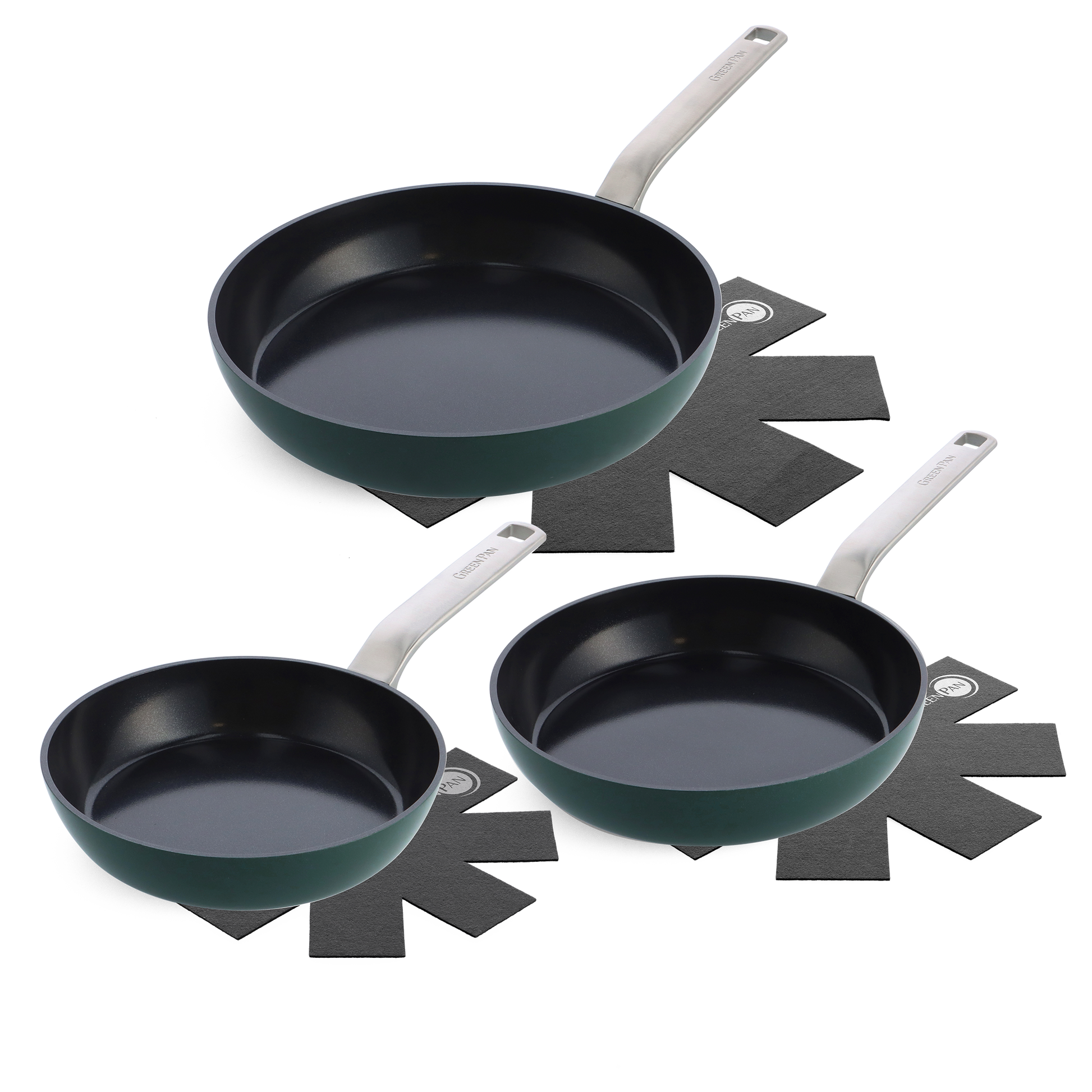 Diese Kollektion in elegantem Pine Green hat ein cleveres Design, das der Umwelt zugute kommt. Die Artikel enthalten recyceltes Aluminium und haben einen abnehmbaren Edelstahlgriff. Dadurch lassen sie sich leicht recyceln. Dank der kleineren Verpackung fallen beim Transport dieser Produkte auch weniger CO2-Emissionen an. Das ist gut für den Planeten und außerdem sieht diese Kollektion fantastisch aus! Bei der Lieferung ist der Griff noch nicht an der Pfanne befestigt. Das können Sie ganz einfach selbst anhand unserer praktischen Schritt-für-Schritt-Anleitung tun.